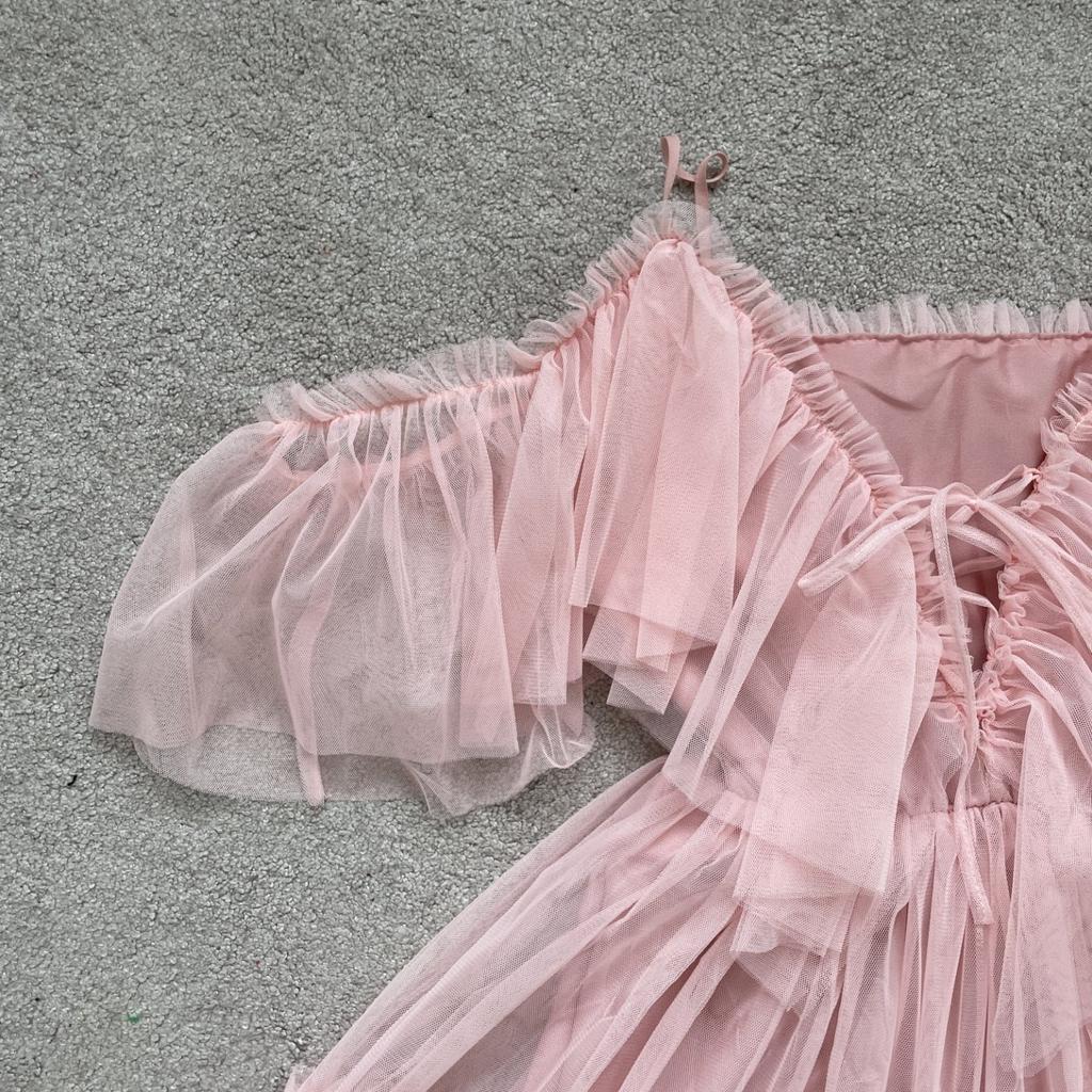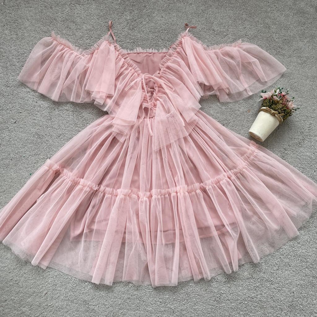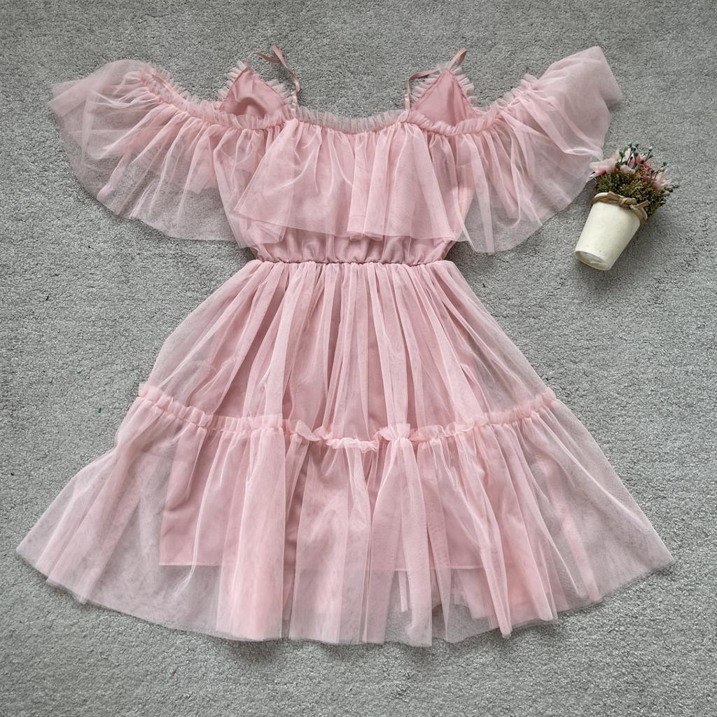 Καλοκαιρινό φόρεμα μονόγραμμης γιακά με στράπλες διχτυωτό βολάν και φορέματα με μεγάλα κούνια