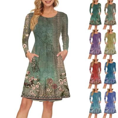 Γυναικείο μοντέρνο φόρεμα με στρογγυλή λαιμόκοψη με μακρυμάνικο φόρεμα εκτύπωσης χαλαρή μέση πλισέ casual φόρεμα