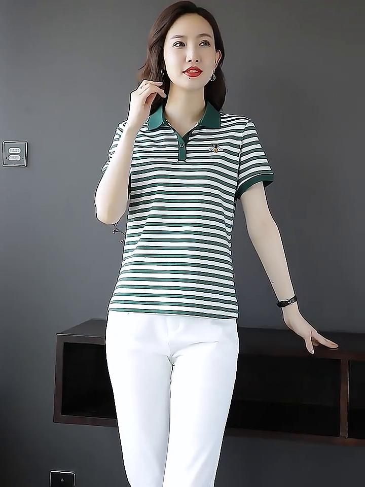YYFS Γυναικεία μόδα Casual Καλοκαιρινή ριγέ στάμπα με κοντό μανίκι POLO μπλούζες και πουκάμισα