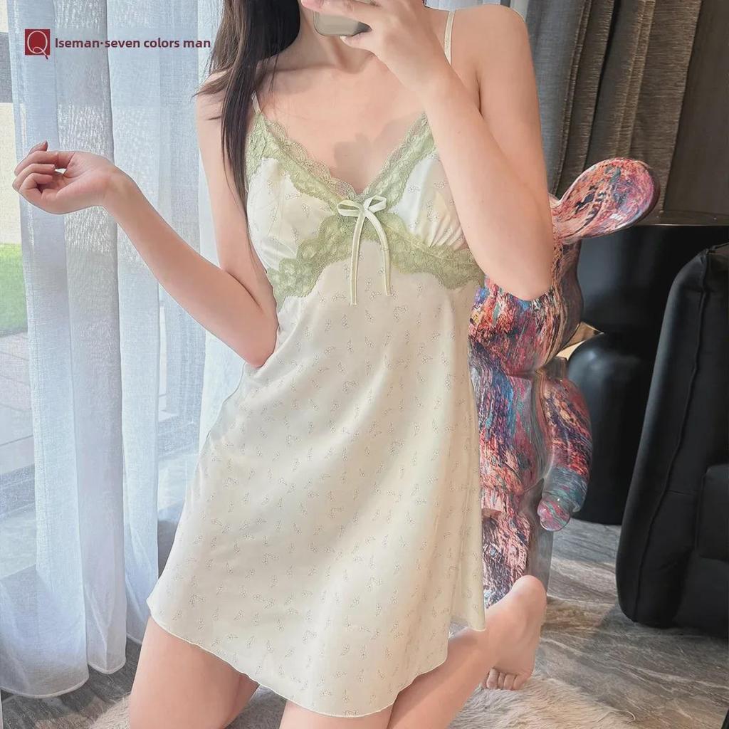 2024 Pure Desire Lace Suspender Nightdress with Chest Pads - Women's Floral Ice Silk Summer Dress for Pajamas or Outerwear