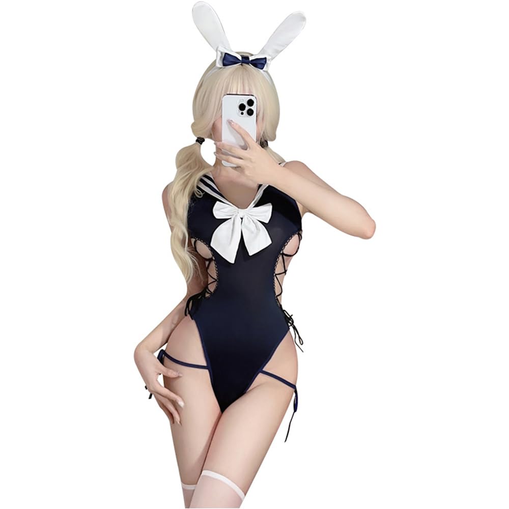 Bunny Girl Navy Open Chest Sailor Uniform School Swimsuit with Stockings Bow Tie Sexy Cosplay Reverse Bunny Lingerie Rabbit Training Temptation