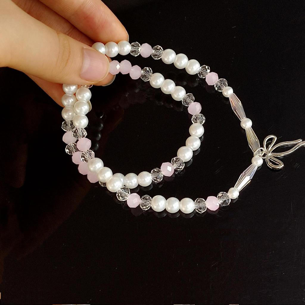 Korean Pink Beaded Bow Double-Layer Elastic Bracelet for Women - 2025 New Arrival