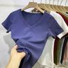 Κοντομάνικη Μπλούζα για Γυναίκες Καλοκαίρι Νέο Στυλ Γυναικείων Ρούχων Λαιμόκοψη V Μονόχρωμη Βαμβακερή Μπλούζα Καμπύλη Πατιλέτα Τοπ Μέσης