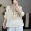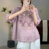 Johnature Women Embroidery Floral Shirts Tops O-Neck Half Sleeve Blouses Summer Vintage Solid Color Shirts