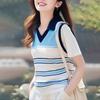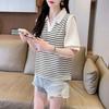 Fake Two Piece Shirt Patchwork V-neck Striped Polo Shirt Knitted T-shirt for Women's Design Sense Short Bubble Short Sleeved Top for Summer