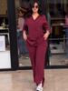 Καλοκαιρινό γυναικείο κοντομάνικο τοπ μακρύ παντελόνι μόδας μονόχρωμο κοστούμι με λαιμόκοψη σε V