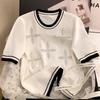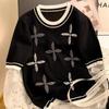 Μπλουζάκια από Μετάξι Lce με Στρογγυλή Λαιμόκοψη και Χάντρες Μόδα Γλυκά Πλεκτά Κοντομάνικα T-shirt Καλοκαίρι Φαρδιά Μαύρα Τοπ Γυναικεία