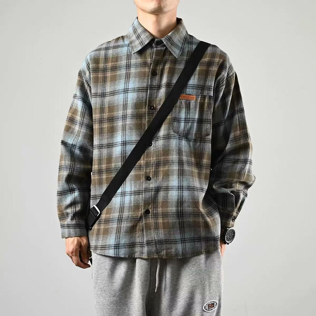 Japanese Style Retro Plaid Shirt Women's Lapel Long-Sleeved Shirt Cashmere Short Coat Couple's Loose Version Spring and Autumn Fashion