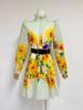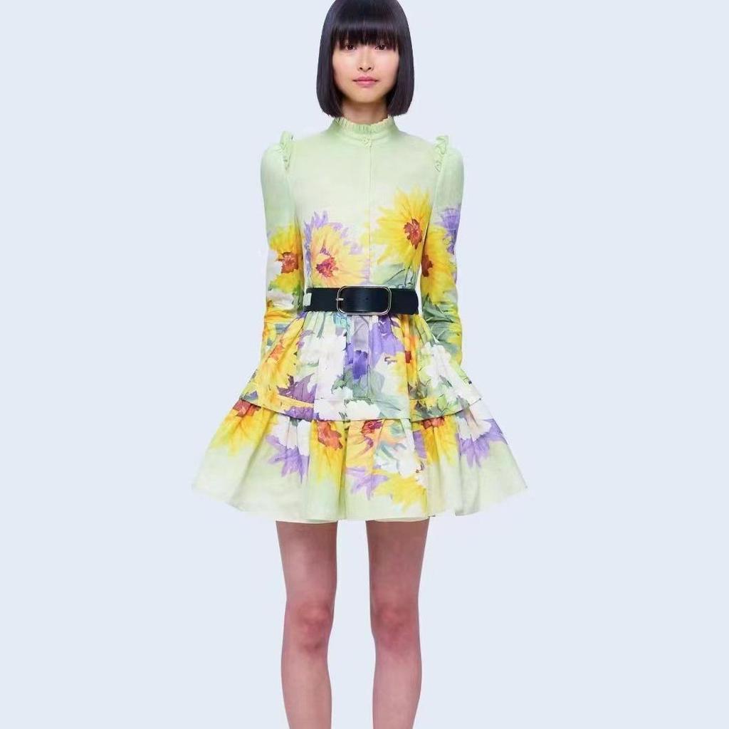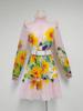 Sunflower Print Lace A-Line Dress with Stand-Up Collar & Long Sleeves