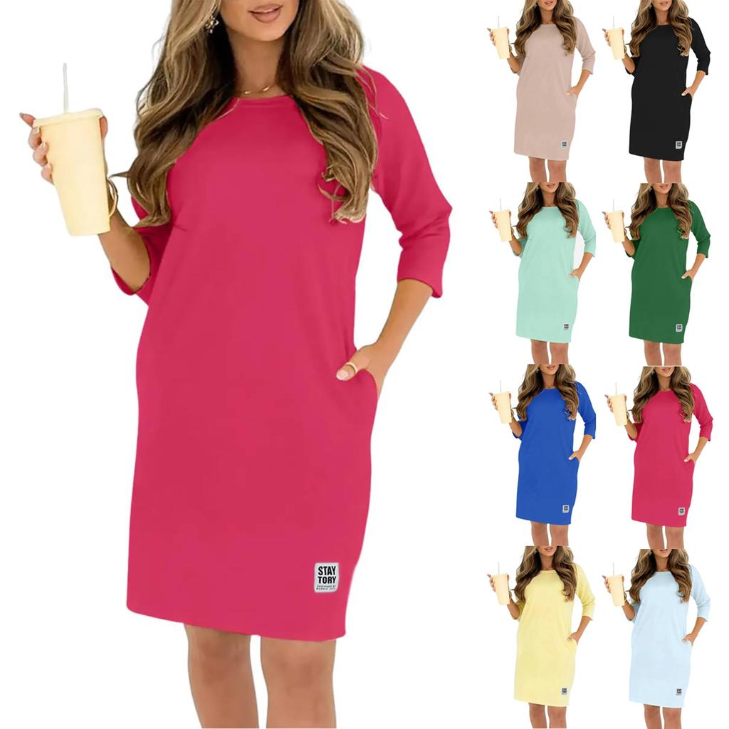 Γυναικείο Μοντέρνο Μονόχρωμο Φόρεμα με Στρογγυλή Λαιμόκοψη, Άνετη Γραμμή