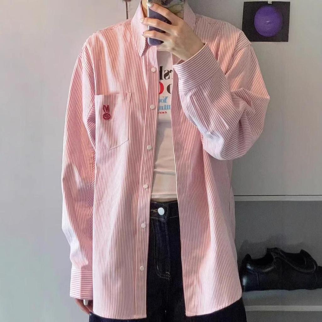 Discover a charming addition to your wardrobe with this women's pink striped shirt, designed for the spring and summer seasons. Crafted entirely from cotton, this shirt promises comfort and breathability. It features long sleeves and a relaxed, loose fit, perfect for a laid-back, casual look. The round neckline adds to its leisurely style, while the delightful Japanese sweet rabbit embroidery provides a unique and playful touch. Ideal for those who embrace a new lazy style with a hint of whimsy.
