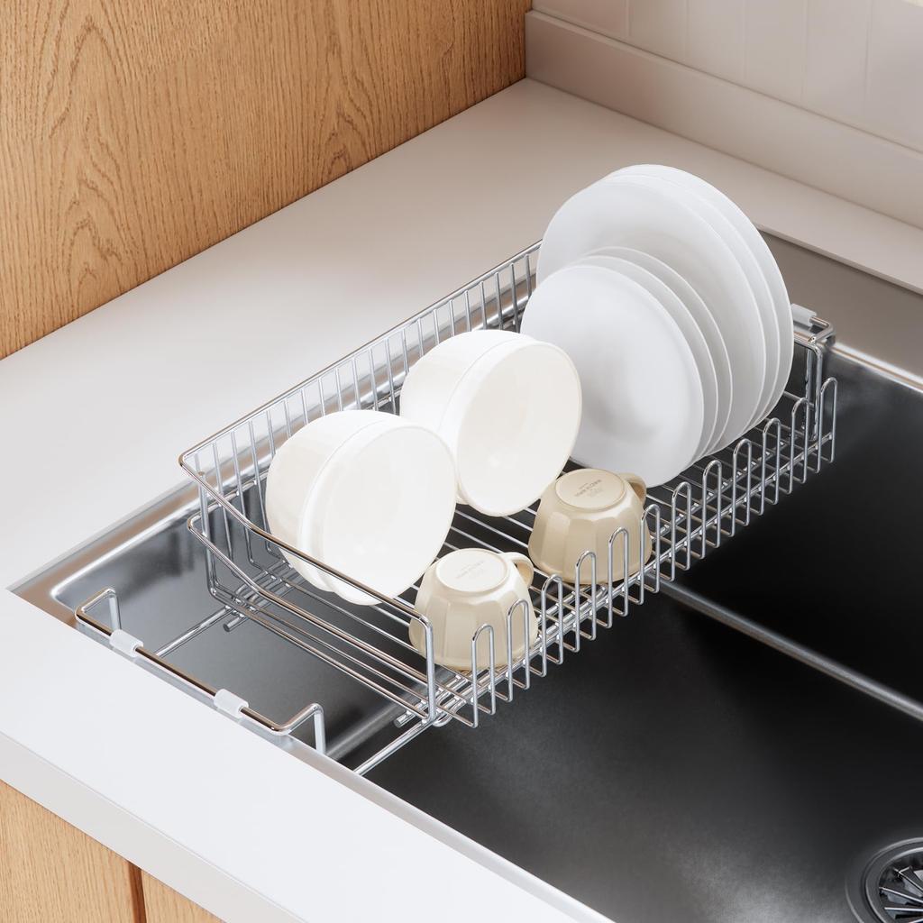 [Space Utilization] The extendable drain rack uses a freely extendable arm that can be extended from 38.5 cm to 51.5 cm, allowing you to freely adjust it to fit the size of your sink and make the most of your limited space. This highly adaptable drain basket blends beautifully into kitchens of different styles and can satisfy the needs of a variety of customers.