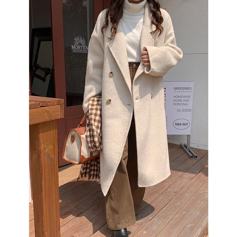 Q576 Albaka camel wool double-sided hand-sewn coat women, long-haired suit collar double-breasted woolen coat