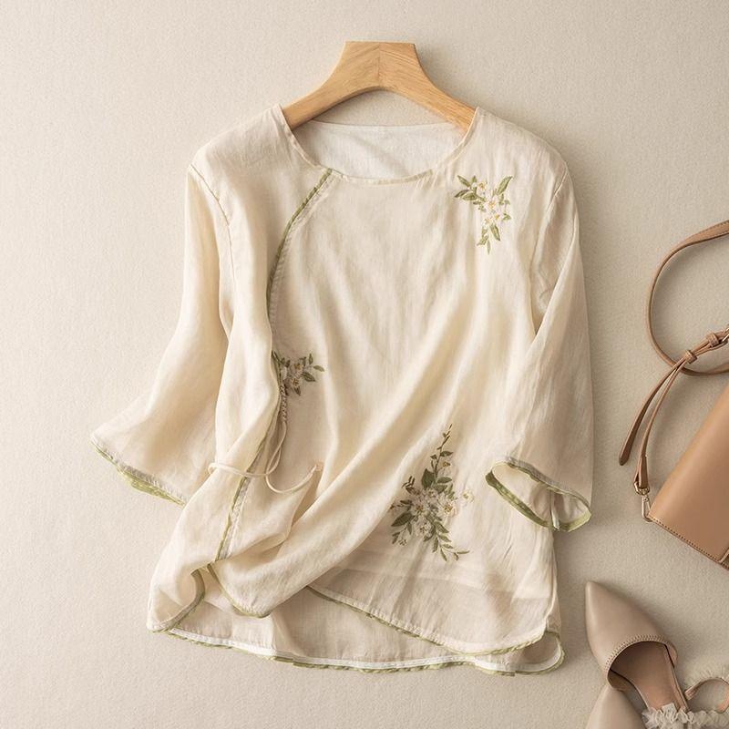 Cotton and linen literary and retro five-quarter-sleeved short-sleeved top, exquisite embroidered T-shirt, summer new versatile women