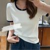 New contrasting color front shoulder U-neck short-sleeved T-shirt women's fashion versatile and thin top summer