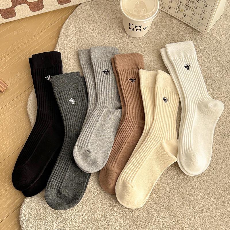 Female Autumn and Winter Pure Cotton Embroidery Small Bee Pit Tide Stripe In The Tube Pile Socks