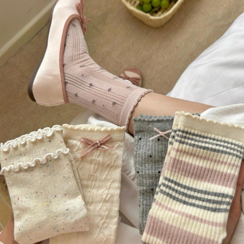 Female Spring and Autumn Sweet Light Pink Tie Bowtie Boneless In The Tube Pile Pile Socks