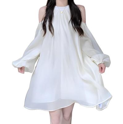 Toa Soa Mini Beautiful Long Chiffon Flare Off-the-Shoulder Dress, Women's, Sleeve, A-Line (02 - L, Black)