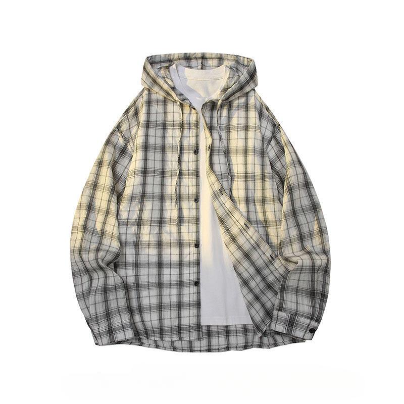 Hooded Plaid Long-sleeved Shirt Men and Women Loose Shirt Sun Protection Jacket American Retro Thin Button Cardigan