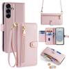 For Samsung Galaxy S25 Leather Case Zipper Pocket Wallet Phone Cover with 2 Straps