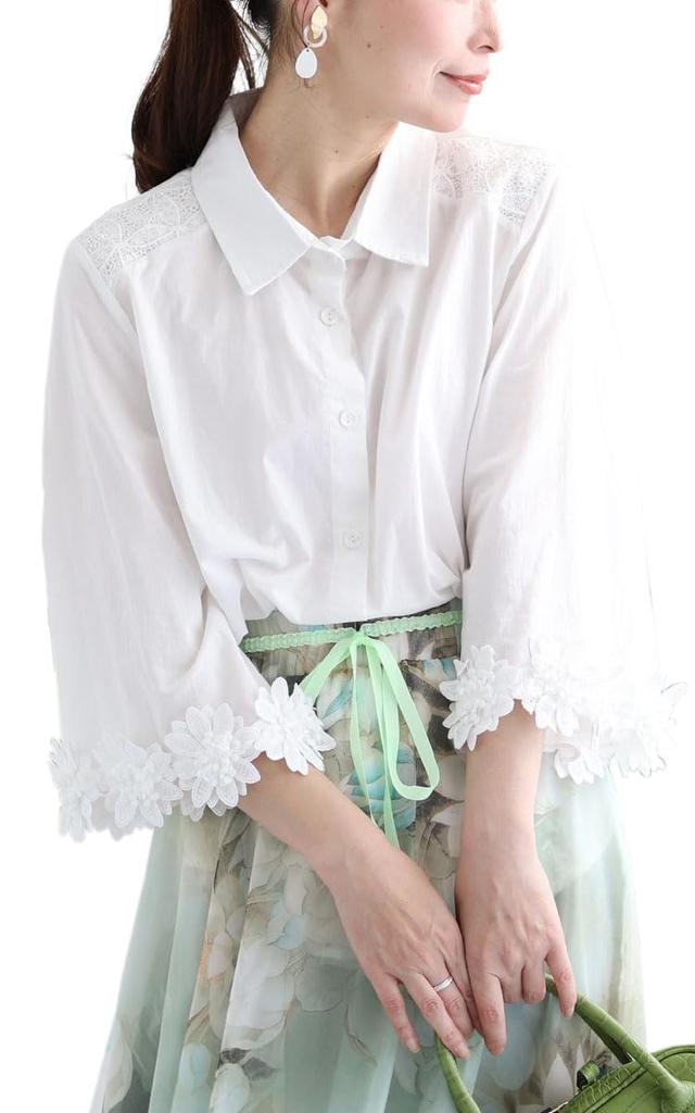 Sawa la mode Floral Bouquet Flare Sleeve Cotton Shirt Free White á Women's Blouse, Mode-8634, Size,