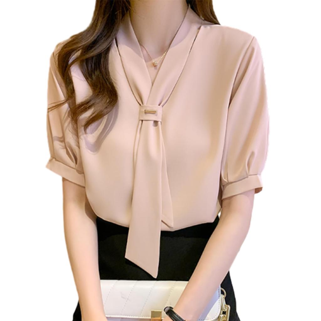This short-sleeved ribbon blouse is cute yet sophisticated. It features a V-neck that shows off your collarbone and a bowtie design. The brooch attached to the tie adds an accent, creating a sophisticated look that takes it up a notch. The loose puff sleeves also make you look slimmer, which is a nice bonus. The overall design is a classic solid color, and this short-sleeved chiffon shirt creates a simple yet feminine and elegant look.
