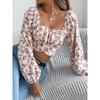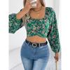 Φθινοπωρινό Τοπ με Φλοράλ Μανίκια Φανάρι, Δέσιμο, Σούρα στη Μέση, Κοντό για Γυναίκες