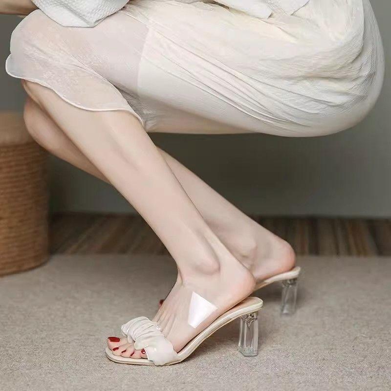 Διαφανείς κρυστάλλινες γαλλικές παντόφλες με ψηλό τακούνι, δροσερές, 2025 καλοκαιρινά νέα γυναικεία παπούτσια, φοριούνται ευέλικτα, ψηλά τακούνια, χαμηλά τακούνια