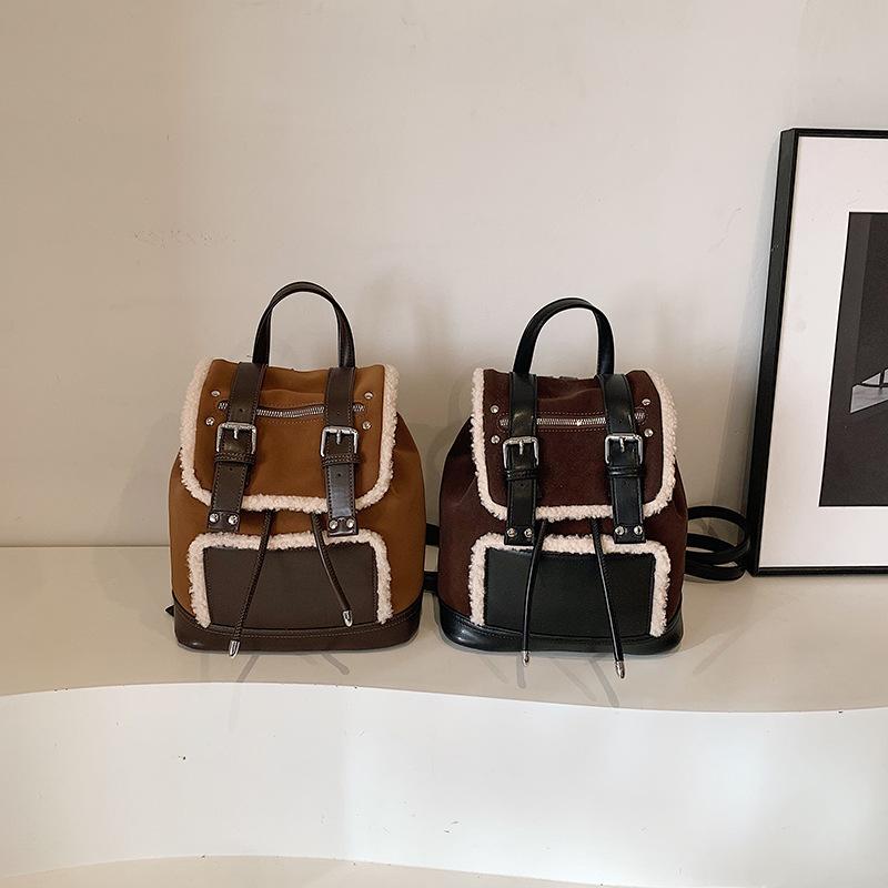 Autumn and winter retro matte drawstring backpack women's new lamb wool splicing texture portable backpack