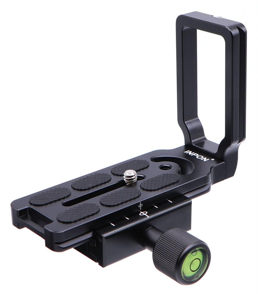 The L-shaped quick release plate has grooves on the bottom and left side, allowing it to be attached to Arca-Swiss standard clamps and heads in either portrait or landscape orientation. Examples include Sunwayfoto, Arca Swiss, RRS, Kirk, Wimberley, Markins, and Benro.