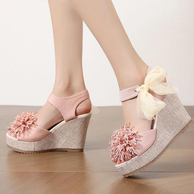 Fashion Sandals Women's Floral Pattern Bowknot Decor Platform Wedge Espadrilles Platform Bow 10CM High Heels Women's Slippers Shoes