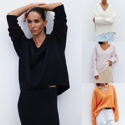 Autumn New Product Women clothes French style Design Sense Solid Rib V-neck Long sleeve Plain Stitch Knit 3471028