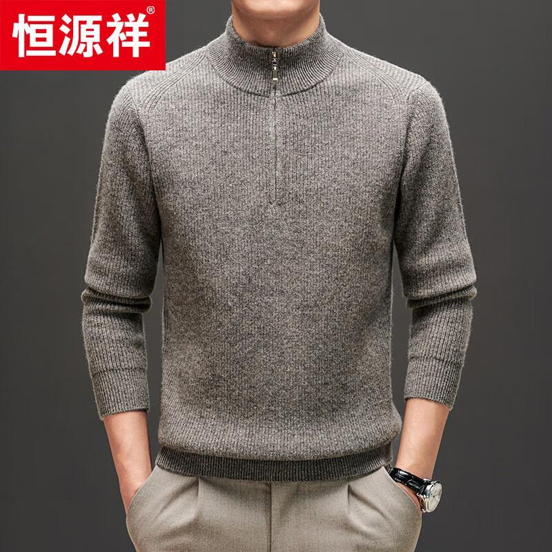 Hengyuanxiang Men's 100% Wool Stand Collar Zipper Knit Sweater