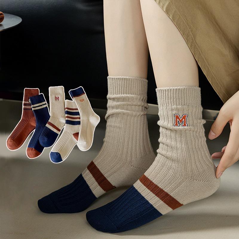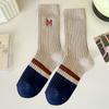 Women's Autumn and Winter Striped Embroidered Lettered Mid Calf Cotton Socks