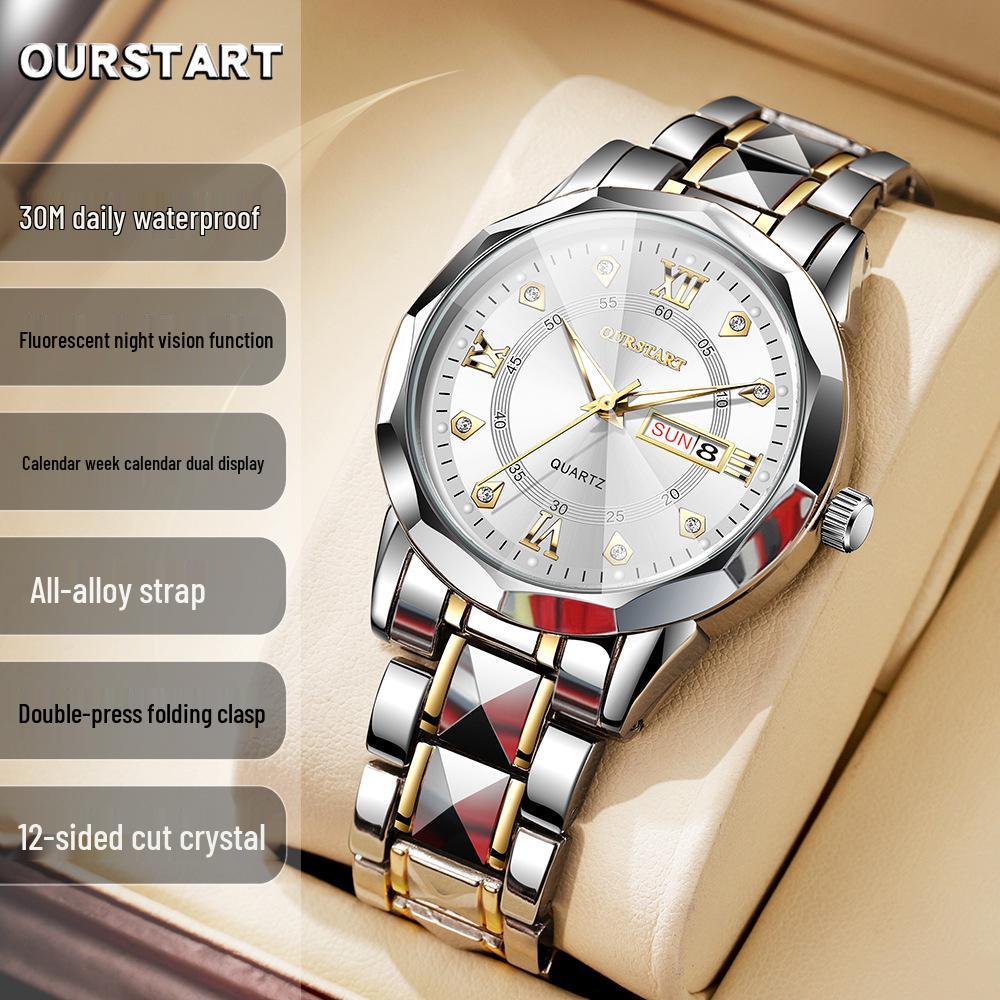 Men's Luminous Waterproof Quartz Watch with Rivet Steel Band & Double Calendar Display