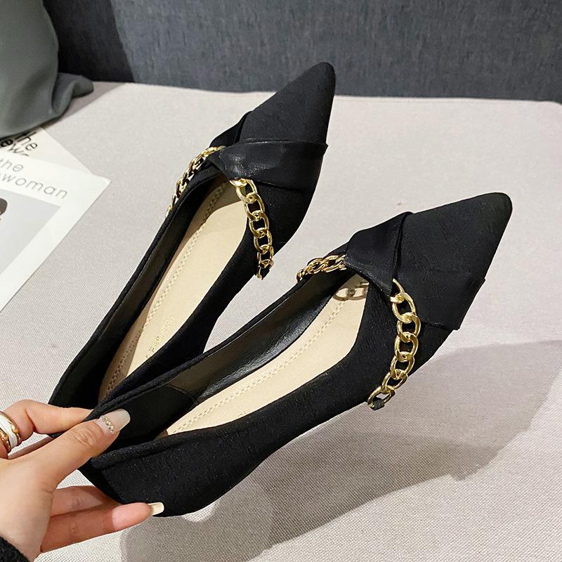 Fashion new designer metal chains flat shoes woman lace band ballet flats pointed toe stripe fabric slip on loafers women working shoes