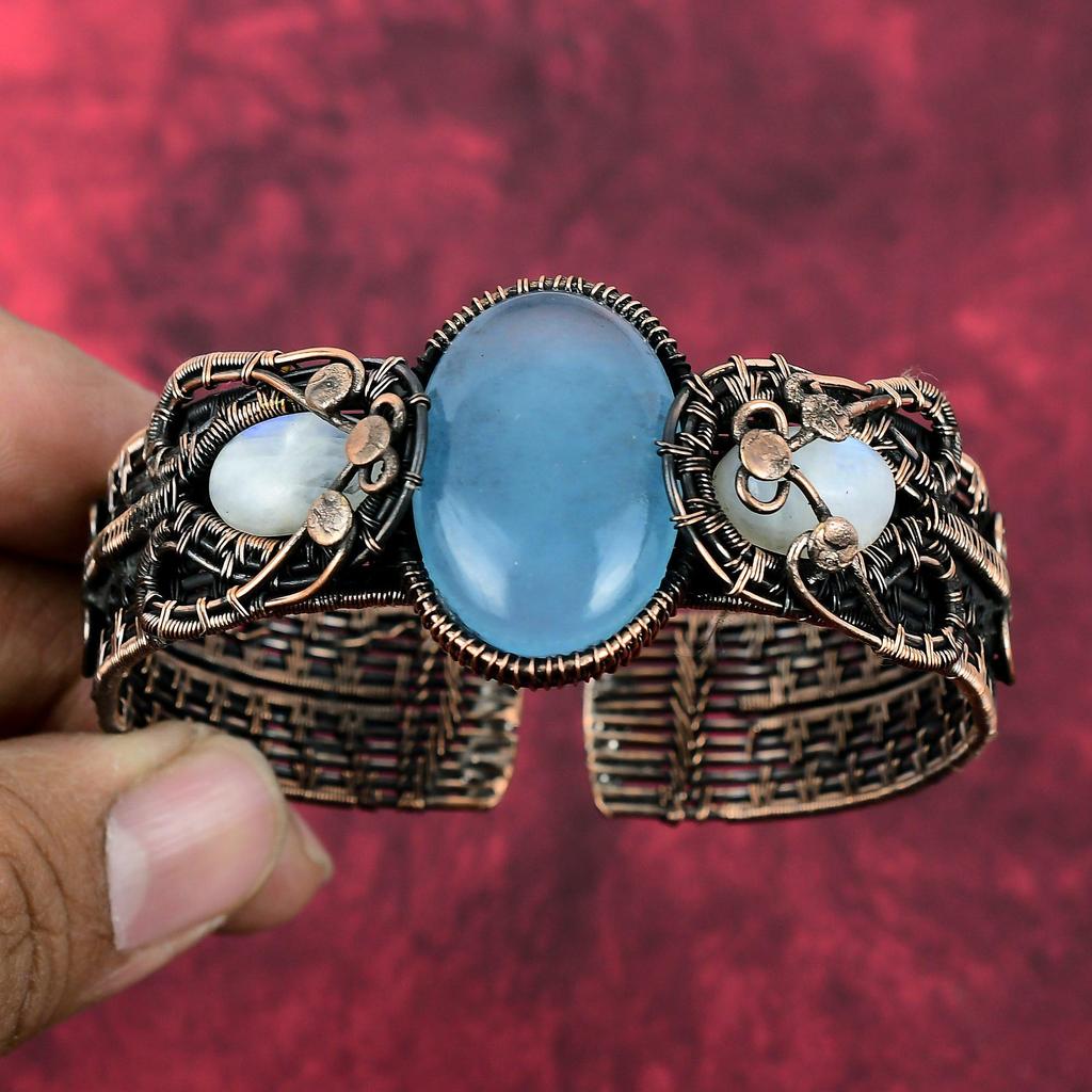 Aquamarine Bangle Copper Wire Wrapped Cuff Bracelet Handmade Adjustable Bangle Rainbow Moonstone Gemstone Cuff Copper Jewelry Gifts For Him