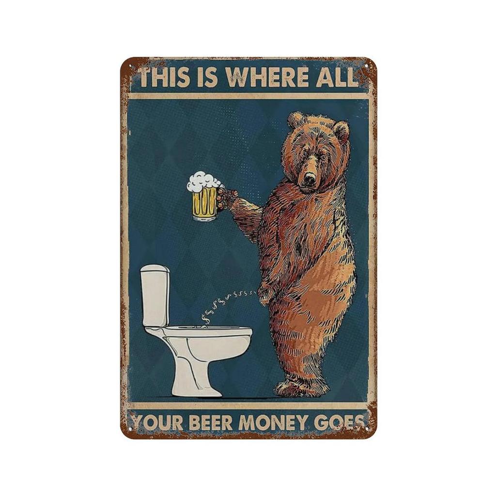 Ρετρό Αστεία Τέχνη Τοίχου Μεταλλικές Πινακίδες Διακόσμηση Αφίσες Αρκούδα Πίνει Μπύρα στην Τουαλέτα Εικόνα για Δωμάτιο Τουαλέτα