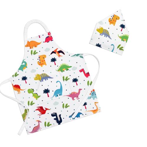 Athbavib Kids' Apron, Cute Dinosaur, White, with Triangle Scarf and Pockets, Adjustable, 50*60cm, Waterproof Cotton, Easy Care, for Boys and Girls, Ki