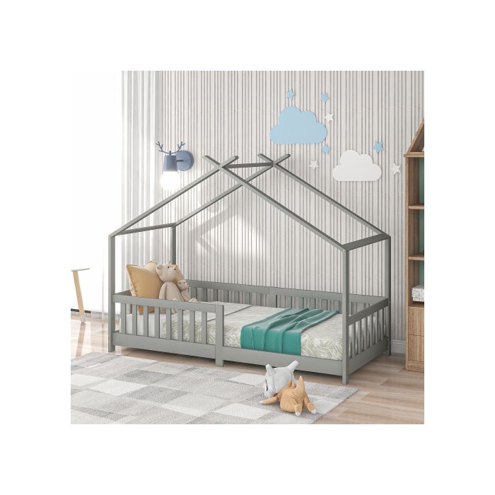 Παιδικό κρεβάτι - MUVOE - 200x90cm - Μασίφ ξύλο - Γκρι - Προστατευτικό κάγκελο