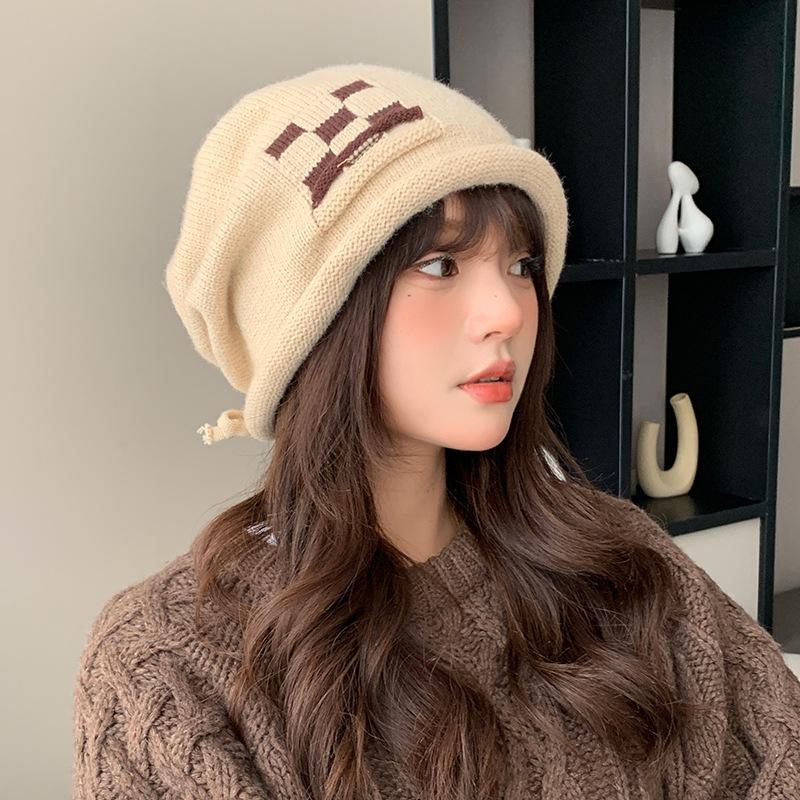 Winter Warm Knitted Hat with Personalized Rolled Edge Drawstring Pile Hat Korean Version Versatile Ear Protection Woolen Hat Pullover Hat for Women