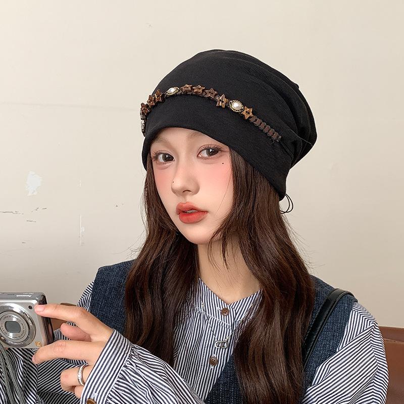 Retro Star Beaded Chain Baotou Hat Women's Summer Thin Breathable Versatile Pile Hat Large Head Circumference Pullover Cold Hat