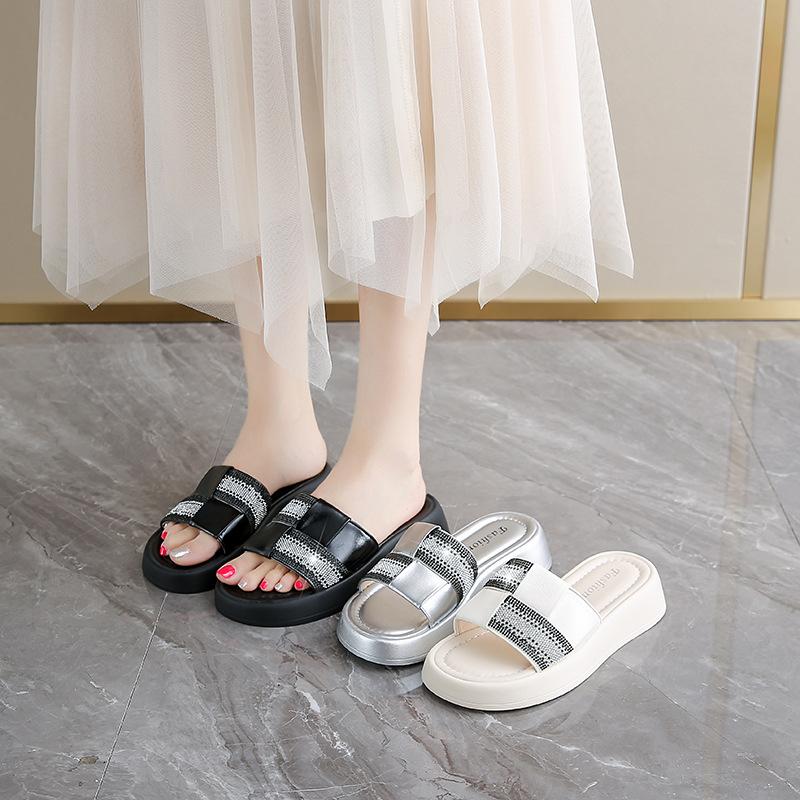 Thick-bottomed outer wear color matching one-word slippers women's spring and summer 2025 new super fire fashion rhinestone seaside beach mop