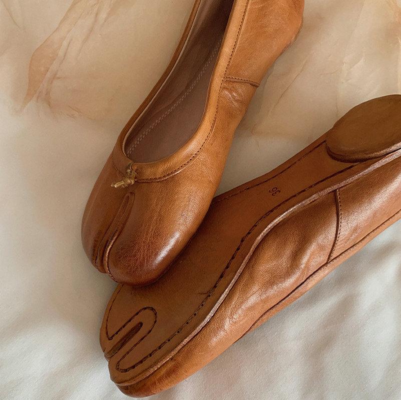 2025A Νέο Στυλ Παπούτσια με Διαχωρισμό Δακτύλων Πλυμένα με Δέρμα, Γυναικεία Ρηχά Ασημί Παπούτσια Μονά 'Οπλή Χοίρου' και Μπαλαρίνες