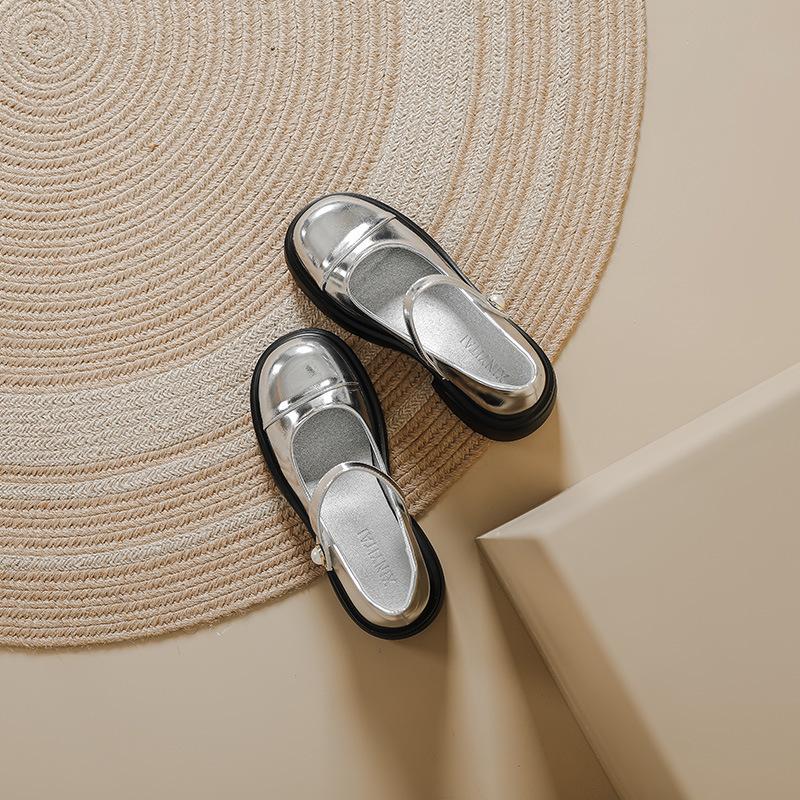 Silver Mary Jane shoes women's pearl one-word thick-soled light-mouth single shoes women's small fragrant wind round head thick heel jk shoes