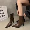 Γαλλικές Vintage Μποτάκια με Κόψιμο σε Καφέ Ελαστικό Δέρμα Γυναικεία Φερμουάρ Πίσω στο Κεφάλι Ψηλοτάκουνα Μποτάκια Κοντές Κάλτσες Μποτάκια