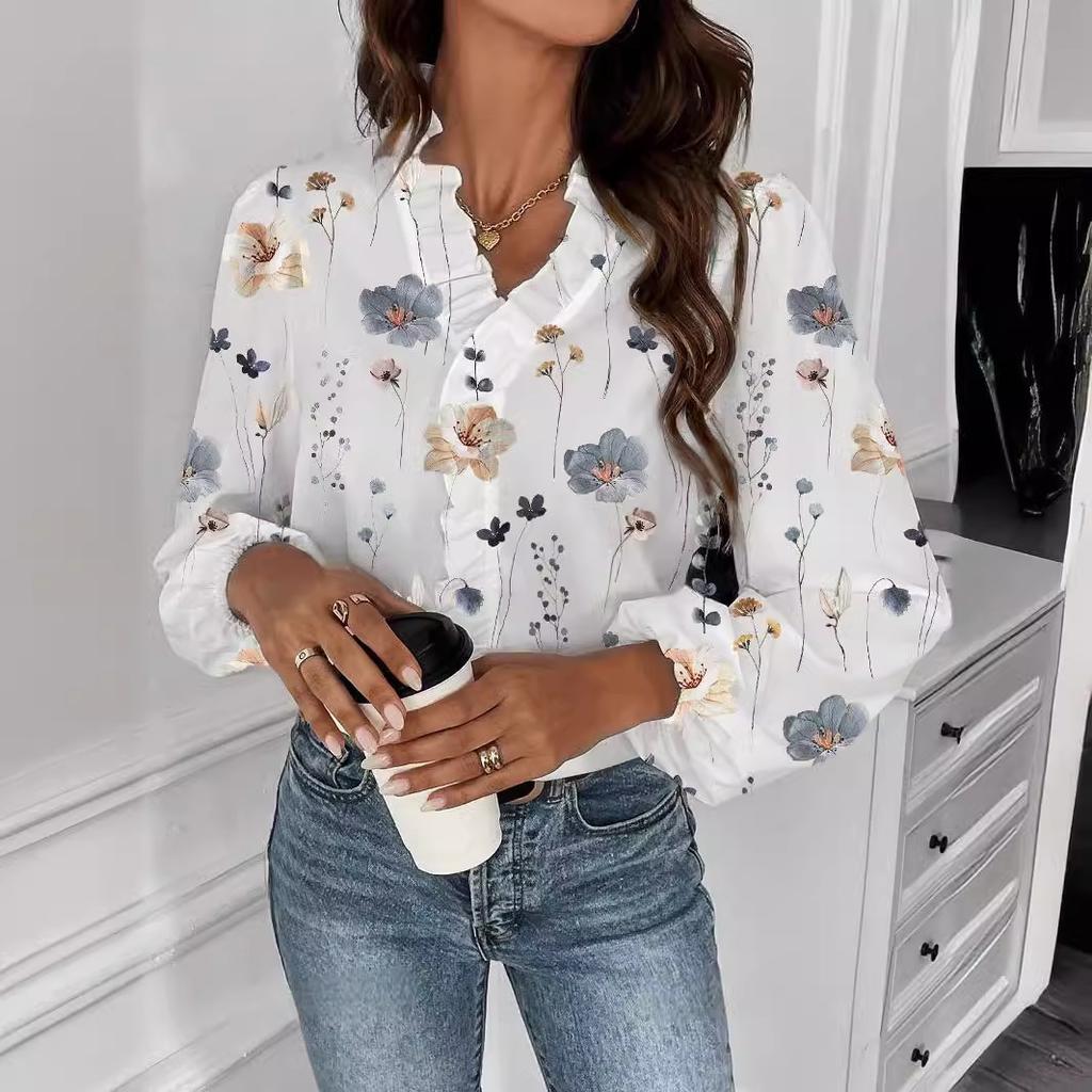 Women's Printed Stand-up Collar Ramie Shirt Top