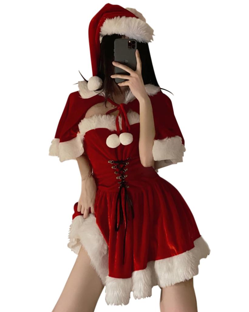 [Popular Value Set] Hat + Dress + Cape + Transparent Strap. This set includes everything you need for Santa cosplay. Transform into a cute Santa girl easily and affordably.