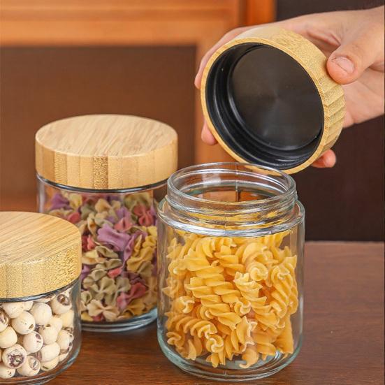 Natural Bamboo Lid: Enhance your kitchen's aesthetic with the natural bamboo wood lids that offer a warm touch and rustic charm. The carefully designed cover complements the glass body, creating a visually appealing storage solution for grains, dried fruits, or tea leaves.