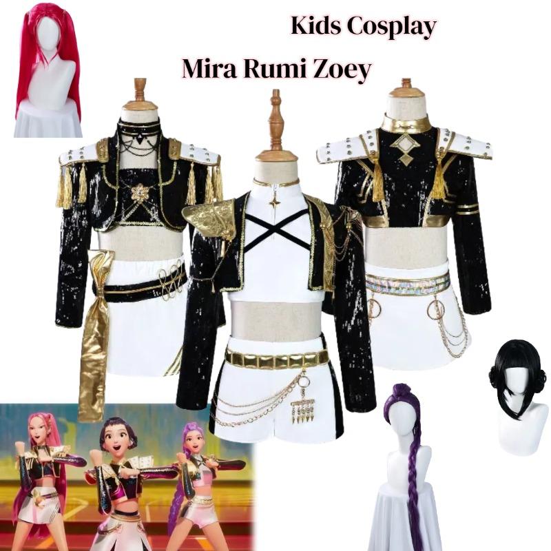 Παιδική Kpop Δαίμονες Κυνηγοί Μίρα Ρούμι Ζόι Κοστούμι Cosplay Μαύρο Χρυσό Στολή Παράστασης Επί Σκηνής Περούκα Κοστούμι Κορίτσια Ρόλοι Ρούχα